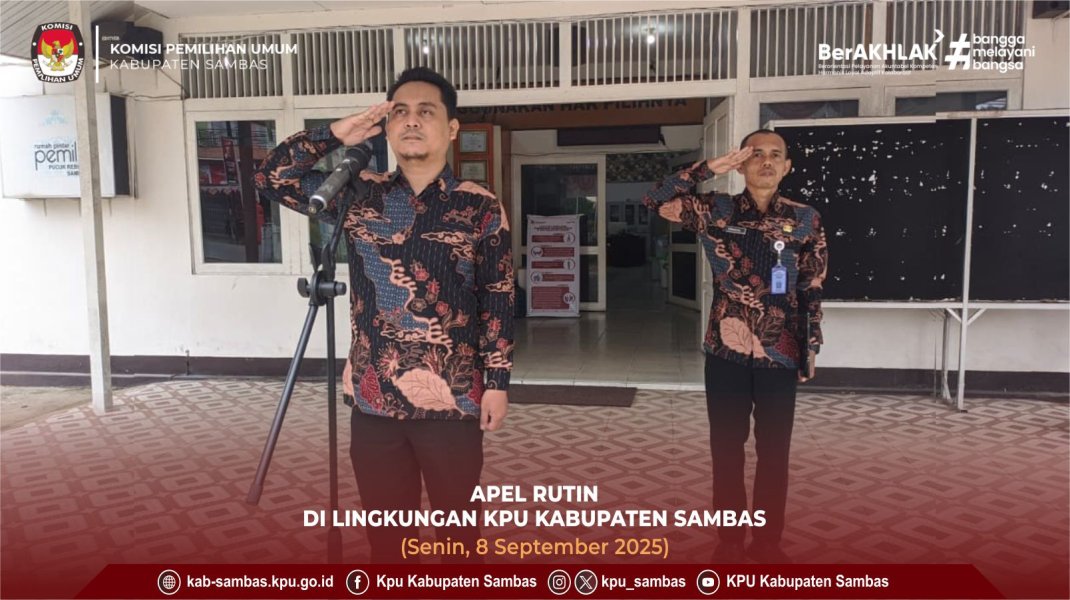 sambas.kpu.go.id - Sambas, KPU Kabupaten Sambas Melaksanakan Apel Rutin Senin. Bertindak Sebagai Pembina Ketua Divisi Teknis Penyelenggaraan KPU Kabupaten Sambas, Juliansyah. Diikuti Ketua dan Anggota KPU Kabupaten Sambas, Sekretaris, Kasubbag, Pegawai dan Staf Sekretariat KPU Kabupaten Sambas Beserta Peserta Magang Mahasiswa Perguruan Tinggi POLTESA Dalam Rangka Kerja Praktek di KPU Kabupaten Sambas. Senin (8/9/2025). Bertempat di Halaman Kantor KPU Kabupaten Sambas.
