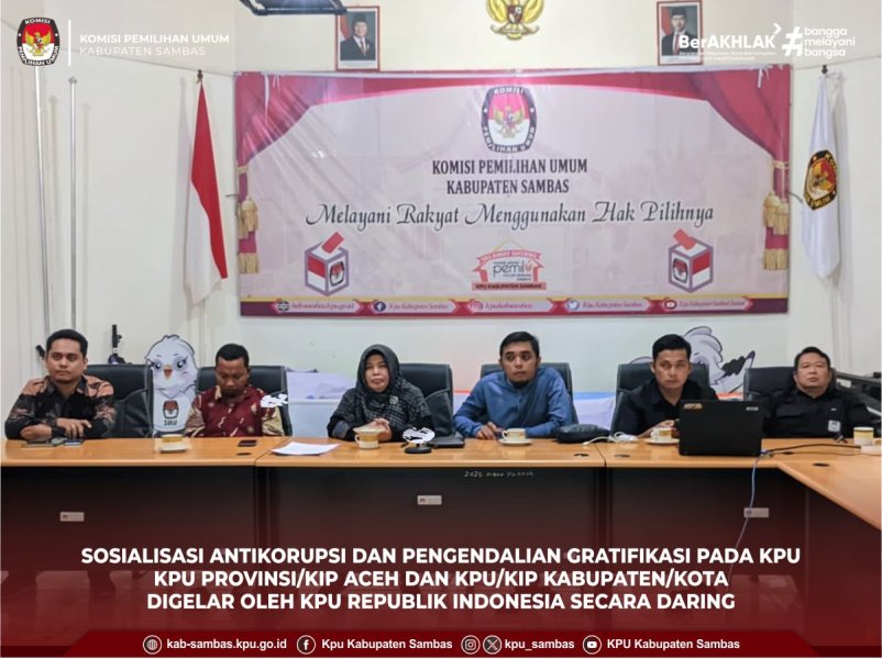 sambas.kpu.go.id - KPU Kabupaten Sambas Mengikuti Sosialisasi Antikorupsi dan Pengendalian Gratifikasi pada KPU, KPU Provinsi/KIP Aceh dan KPU/KIP Kabupaten/Kota yang Digelar Oleh Komisi Pemilihan Umum Republik Indonesia Secara Daring. Senin (8/9/2025). Peserta yang Hadir Ketua dan Anggota KPU Kabupaten Sambas, Sekretaris KPU Kabupaten Sambas, Kasubbag dan Staf Sekretariat KPU Kabupaten Sambas