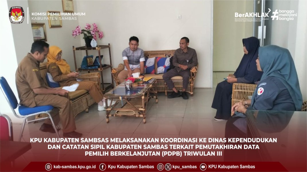 sambas.kpu.go.id - KPU Kabupaten Sambas melaksanakan koordinasi dengan Dinas Kependudukan dan Catatan Sipil (Disdukcapil) Kabupaten Sambas terkait Pemutakhiran Data Pemilih Berkelanjutan (PDPB) Triwulan III Tahun 2025. Selasa, 16 September 2025 Kordinasi dilaksanakan oleh Ketua Divisi Perencanaan, Data dan Informasi Kabupaten Sambas, Operator Sidalih KPU Kabupaten Sambas serta Bersama Ketua dan Staf Sekretariat Bawaslu Kabupaten Sambas. Koordinasi ini merupakan bagian dari upaya berkelanjutan KPU untuk memastikan data pemilih selalu akurat, mutakhir, dan valid dengan dukungan data kependudukan dari Dinas Kependudukan dan Catatan Sipil (Disdukcapil). Kolaborasi antar lembaga ini menjadi langkah penting dalam menjamin hak pilih masyarakat Kabupaten Sambas pada Pemilu dan Pemilihan yang akan datang.