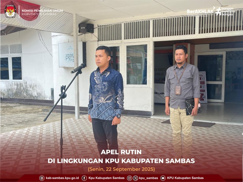 sambas.kpu.go.id - Sambas, KPU Kabupaten Sambas Melaksanakan Apel Rutin Senin. Bertindak Sebagai Pembina Ketua Divisi Perencanaan, Data dan Informasi KPU Kabupaten Sambas, Risno. Diikuti Ketua dan Anggota KPU Kabupaten Sambas, Sekretaris, Kasubbag, Pegawai dan Staf Sekretariat KPU Kabupaten Sambas Beserta Peserta Magang Mahasiswa Perguruan Tinggi POLTESA Dalam Rangka Kerja Praktek di KPU Kabupaten Sambas. Senin (22/9/2025). Bertempat di Halaman Kantor KPU Kabupaten Sambas.