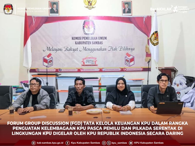 sambas.kpu.go.id - KPU Kabupaten Sambas mengikuti Forum Group Discussion (FGD) Tata Kelola Keuangan KPU dalam rangka Penguatan Kelembagaan KPU Pasca Pemilu dan Pilkada Serentak yang diselenggarakan oleh KPU Republik Indonesia secara daring, Senin (22/9/2025). Kegiatan yang berlangsung di Aula Kantor KPU Kabupaten Sambas ini diikuti oleh Sekretaris, Kasubbag Keuangan, Umum, dan Logistik, Kasubbag Perencanaan, Data, dan Informasi, serta Staf Pelaksana Sekretariat KPU Kabupaten Sambas. Salah satu tujuan kegiatan ini adalah untuk memantapkan regulasi pengelolaan keuangan, penyaluran, serta pertanggungjawaban anggaran pasca Pemilu dan Pilkada Serentak Tahun 2024, sekaligus meningkatkan akuntabilitas kelembagaan.