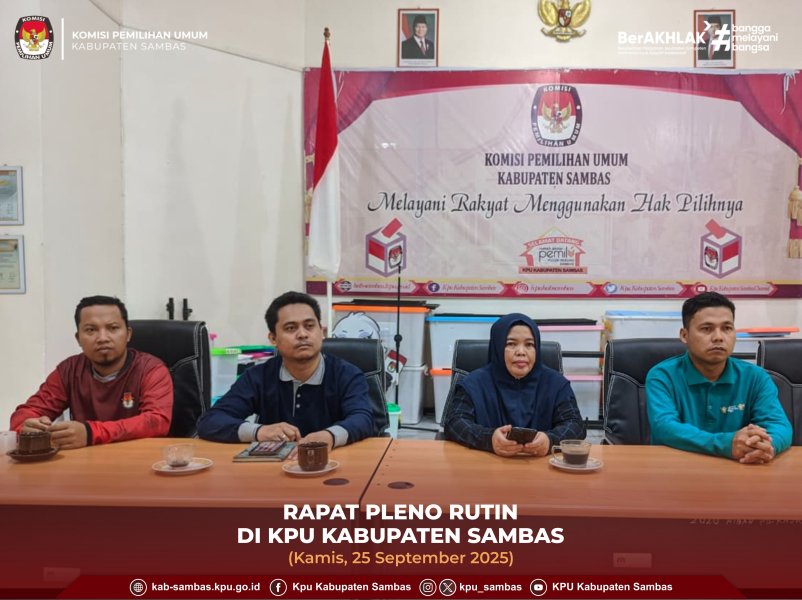 sambas.kpu.go.id - Sambas, KPU Kabupaten Sambas Melaksanakan Rapat Pleno Rutin di Ruang Rapat Kantor KPU Kabupaten Sambas, Kamis (25/9/2025). Rapat Dihadiri Oleh Ketua dan Anggota KPU Kabupaten Sambas, Sekretaris, Kasubbag serta Operator Sekretariat KPU Kabupaten Sambas. Agenda rapat yaitu Evaluasi Kegiatan 1 Minggu Sebelumnya, Rencana Kegiatan 1 Minggu Kedepan, Audiensi Ke Kemenag Kabupaten Sambas, Progres Pendokumentasian Tahapan Teknis Pemilu dan Pemilihan Tahun 2024, Penguatan Kapasitas Staff PPID dan Kehumasan dan Hal-hal lain yang dianggap perlu.