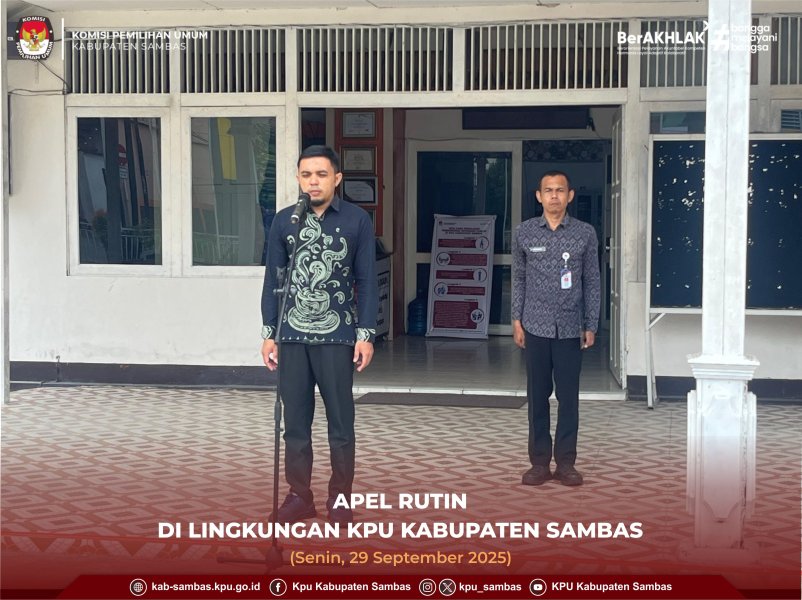 sambas.kpu.go.id - Sambas, KPU Kabupaten Sambas Melaksanakan Apel Rutin Senin. Bertindak Sebagai Pembina Ketua Divisi Sosdiklih Parmas dan SDM KPU Kabupaten Sambas, Aan Sumantri. Diikuti Ketua dan Anggota KPU Kabupaten Sambas, Sekretaris, Kasubbag, Pegawai dan Staf Sekretariat KPU Kabupaten Sambas Beserta Peserta Magang Mahasiswa Perguruan Tinggi POLTESA Dalam Rangka Kerja Praktek di KPU Kabupaten Sambas. Senin (29/9/2025). Bertempat di Halaman Kantor KPU Kabupaten Sambas.