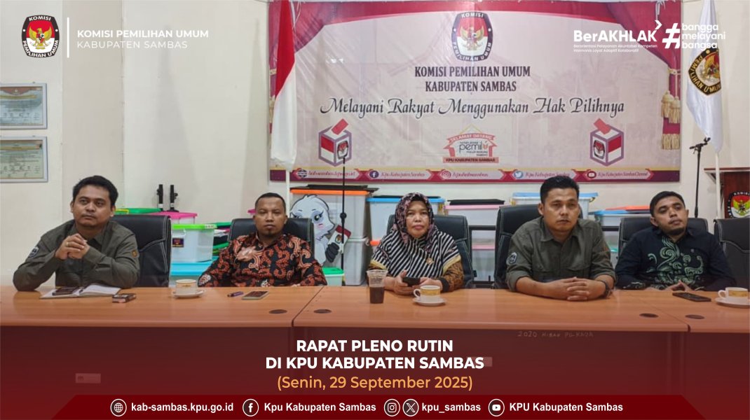 sambas.kpu.go.id - Sambas, KPU Kabupaten Sambas Melaksanakan Rapat Pleno Rutin di Ruang Rapat Kantor KPU Kabupaten Sambas, Senin (29/9/2025). Rapat Dihadiri Oleh Ketua dan Anggota KPU Kabupaten Sambas, Sekretaris, Kasubbag serta Operator Sekretariat KPU Kabupaten Sambas. Agenda rapat yaitu Evaluasi Kegiatan 1 Minggu Sebelumnya, Rencana Kegiatan 1 Minggu Kedepan, Persiapan Rapat Pleno Terbuka Rekapitulasi dan Penetapan Pemutakhiran Data Pemilih Berkelanjutan (PPDB) Triwulan III Tahun 2025, Tindaklanjut Surat Sekretaris Jenderal KPU RI Nomor 2841/PBJ.01.6-SD/05/2024 Tanggal 20 Agustus 2025 Perihal Pengadaan Sarana dan Prasarana Kantor Untuk Calon Pegawai Negeri Sipil Tahun 2025 di Lingkungan Sekretariat KPU Provinsi/KIP Aceh dan Sekretariat KPU/KIP Kabupaten/Kota, Penyampaian Progres Laporan Sistem Pengendalian Intern Pemerintah (SPIP) Bulanan dan Hal-hal lain yang dianggap perlu.