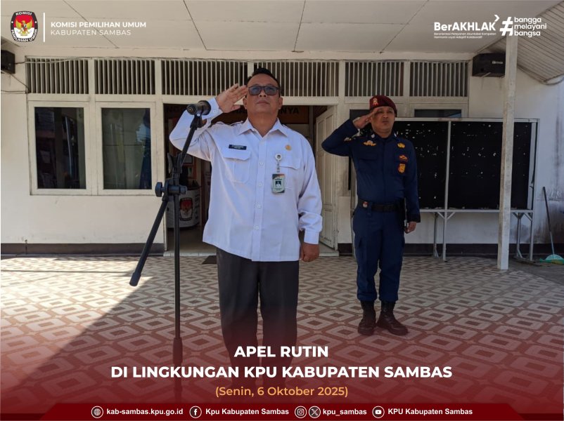 sambas.kpu.go.id - Sambas, KPU Kabupaten Sambas melaksanakan Apel Rutin, bertempat di halaman Kantor KPU Kabupaten Sambas. Apel dipimpin oleh Sekretaris KPU Kabupaten Sambas, Fathurrahman, S.E. selaku pembina apel. Senin (6/10/2025).