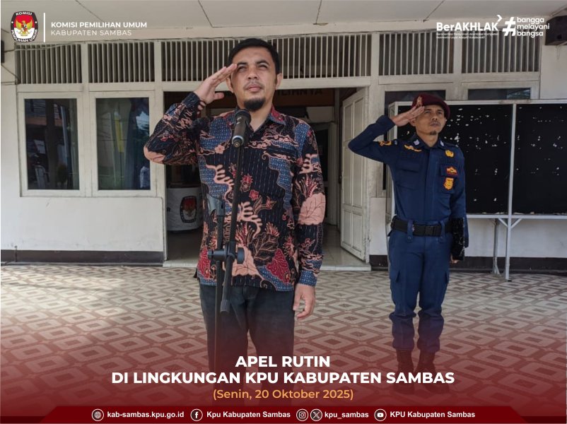sambas.kpu.go.id - Sambas, KPU Kabupaten Sambas melaksanakan Apel Rutin, bertempat di halaman Kantor KPU Kabupaten Sambas. Apel dipimpin oleh Ketua Divisi Sosdiklih, Parmas dan SDM KPU Kabupaten Sambas, Aan Sumantri, S.P., M.E selaku pembina apel. Senin (20/10/2025).