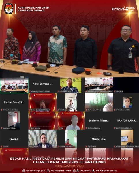 sambas.kpu.go.id - Sambas, KPU Kabupaten Sambas melaksanakan kegiatan Bedah Hasil Riset Data Pemilih dan Tingkat Partisipasi Masyarakat dalam Pilkada Tahun 2024 secara daring bertempat di Aula Kantor KPU Kabupaten Sambas. Rabu (22/10/2025).