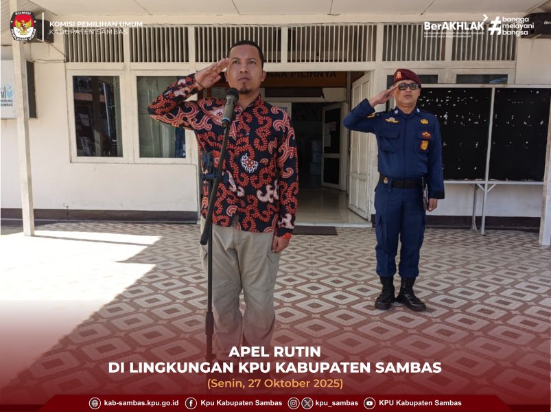 sambas.kpu.go.id - Sambas, KPU Kabupaten Sambas melaksanakan apel rutin yang bertempat di halaman Kantor KPU Kabupaten Sambas. Apel tersebut dipimpin oleh Ketua Divisi Hukum dan Pengawasan KPU Kabupaten Sambas, Eko Fitriansyah, S.Pd selaku pembina apel. Senin (27/10/2025).