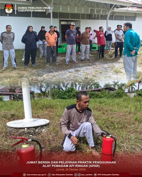 sambas.kpu.go.id - Sambas, KPU Kabupaten Sambas melaksanakan kegiatan kebersihan dan kesiapsiagaan darurat melalui kerja bakti dan Pelatihan Praktik Penggunaan Alat Pemadam Api Ringan (APAR) yang diikuti oleh seluruh Aparatur KPU Kabupaten Sambas Jumat (24/10/2025).