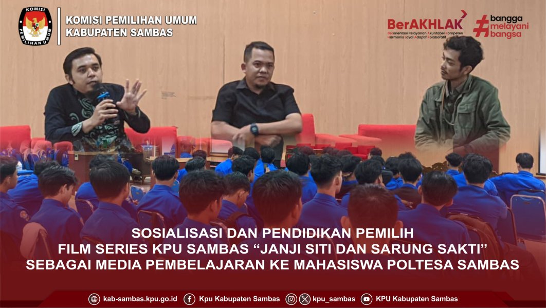 sambas.kpu.go.id - Sambas, KPU Kabupaten Sambas melaksanakan kegiatan Sosialisasi dan Pendidikan Pemilih melalui pemanfaatan Karya Film Series KPU Kabupaten Sambas berjudul Janji Siti dan Sarung Sakti sebagai media pembelajaran bagi mahasiswa di Politeknik Negeri Sambas. Kegiatan ini merupakan upaya KPU Kabupaten Sambas untuk memperkuat literasi kepemiluan di kalangan generasi muda melalui pendekatan kreatif dan edukatif. Rabu (4/12/2025).
