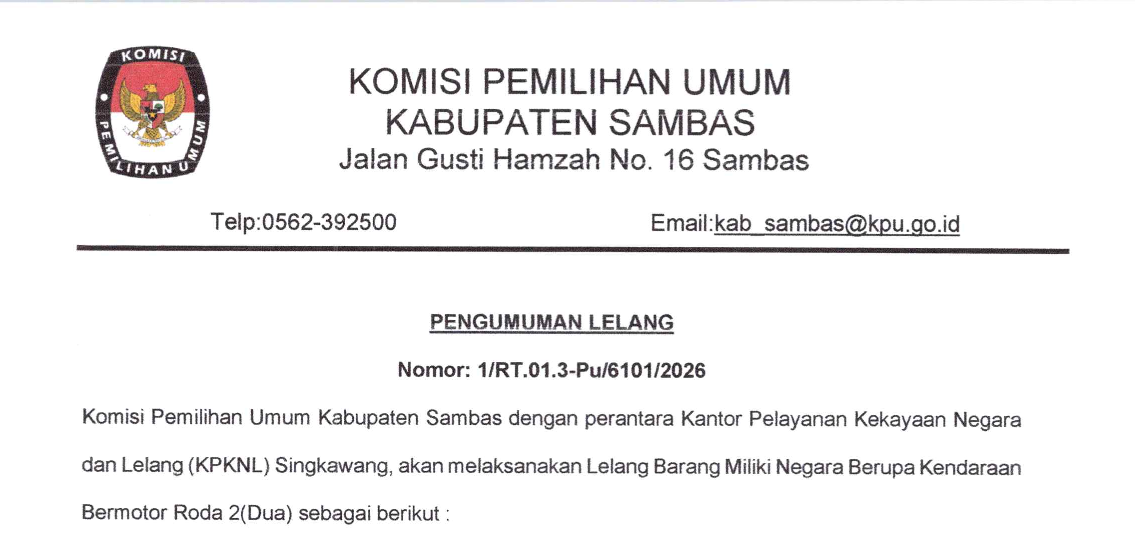 Berikut kami sampaikan PENGUMUMAN PELAKSANAAN LELANG NON EKSEKUSI WAJIB BARANG MILIK NEGARA BERUPA KENDARAAN RODA DUA PADA KPU KABUPATEN SAMBAS MELALUI E-AUCTION OPEN BIDDING