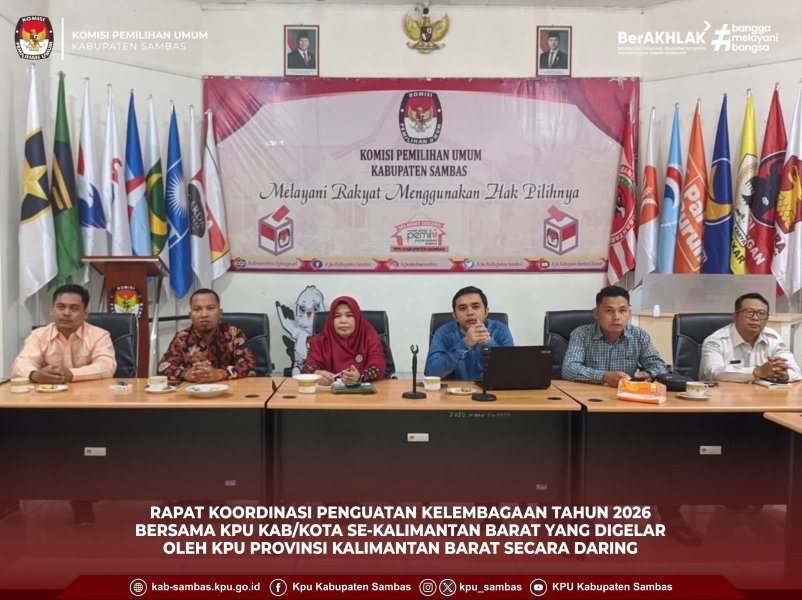 Rapat Koordinasi Dilaksanakan di Ruang Aula Kantor KPU Kabupaten Sambas, Kamis (29/1/2026). Diikuti Oleh Ketua dan Anggota KPU Kabupaten Sambas, Sekretaris KPU Kabupaten Sambas, Kepala Subbagian Sekretariat KPU Kabupaten Sambas.