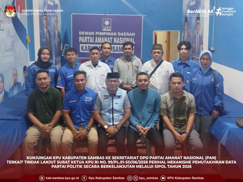 sambas.kpu.go.id - Sambas, KPU Kabupaten Sambas melaksanakan kunjungan ke Sekretariat DPC Partai Politik terkait Mekanisme Pemutakhiran Data Partai Politik Secara Berkelanjutan melalui Sistem Informasi Partai Politik (SIPOL) Tahun 2026. Kunjungan ini dilaksanakan di Sekretariat DPD Partai Amanat Nasional (PAN) Kabupaten Sambas. Jumat (20/2/2026).