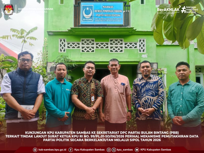 sambas.kpu.go.id - Sambas, KPU Kabupaten Sambas melaksanakan kunjungan ke Sekretariat DPC Partai Politik terkait Mekanisme Pemutakhiran Data Partai Politik Secara Berkelanjutan melalui Sistem Informasi Partai Politik (SIPOL) Tahun 2026. Kunjungan ini dilaksanakan di Sekretariat DPC Partai Bulan Bintang (PBB) Kabupaten Sambas. Senin (23/2/2026).