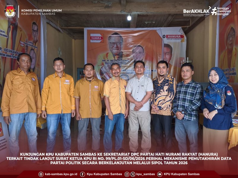 sambas.kpu.go.id - Sambas, KPU Kabupaten Sambas melaksanakan kunjungan ke Sekretariat DPC Partai Politik terkait Mekanisme Pemutakhiran Data Partai Politik Secara Berkelanjutan melalui Sistem Informasi Partai Politik (SIPOL) Tahun 2026. Kunjungan ini dilaksanakan di Sekretariat DPC Partai Hati Nurani Rakyat (HANURA) Kabupaten Sambas. Selasa (17/3/2026).