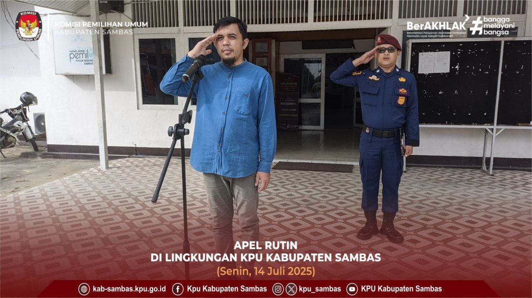 sambas.kpu.go.id-Sambas, KPU Kabupaten Sambas Melaksanakan Apel Rutin Senin. Bertindak Sebagai Pembina Ketua Divisi Sosdiklih Parmas dan SDM KPU Kabupaten Sambas, Aan Sumantri. Diikuti Anggota KPU Kabupaten Sambas, Kasubbag, Pegawai dan Staf Sekretariat KPU Kabupaten Sambas. Senin (14/7/2025). Bertempat di Halaman Kantor KPU Kabupaten Sambas.