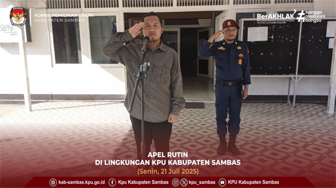 sambas.kpu.go.id-Sambas, KPU Kabupaten Sambas Melaksanakan Apel Rutin Senin. Bertindak Sebagai Pembina Ketua Divisi Hukum dan Pengawasan KPU Kabupaten Sambas, Eko Fitriansyah. Diikuti Ketua dan Anggota KPU Kabupaten Sambas, Sekretaris, Kasubbag, Pegawai dan Staf Sekretariat KPU Kabupaten Sambas. Senin (21/7/2025). Bertempat di Halaman Kantor KPU Kabupaten Sambas.
