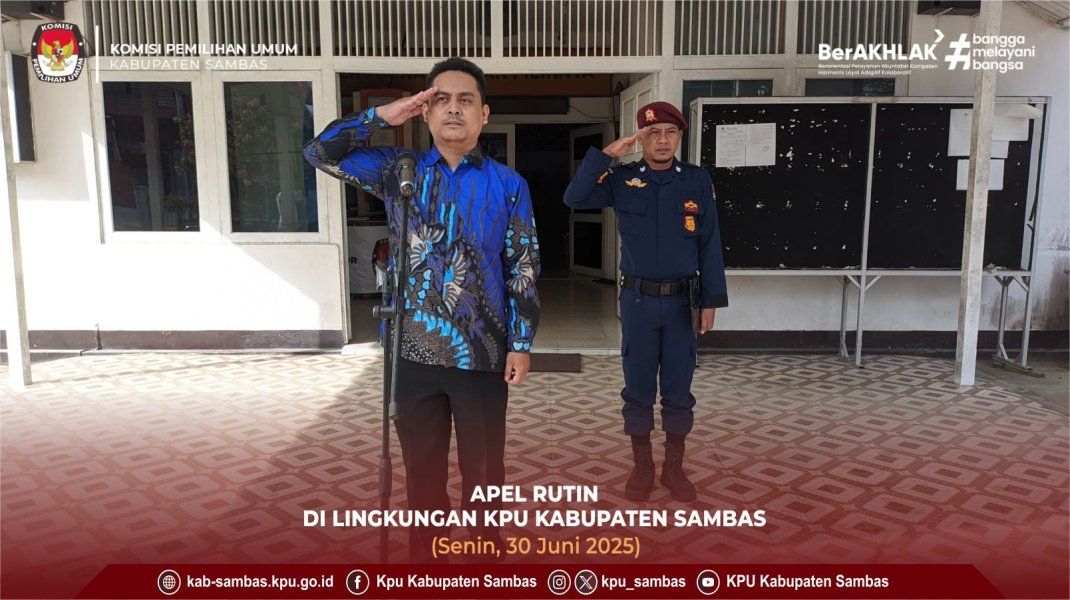 sambas.kpu.go.id - Sambas, KPU Kabupaten Sambas Melaksanakan Apel Rutin Senin. Bertindak Sebagai Pembina Ketua Teknis Penyelenggaraan dan Hukum KPU Kabupaten Sambas, Juliansyah. Diikuti Anggota KPU Kabupaten Sambas, Sekretaris, Kasubbag, Pegawai dan Staf Sekretariat KPU Kabupaten Sambas. Senin (30/6/2025). Bertempat di Halaman Kantor KPU Kabupaten Sambas.