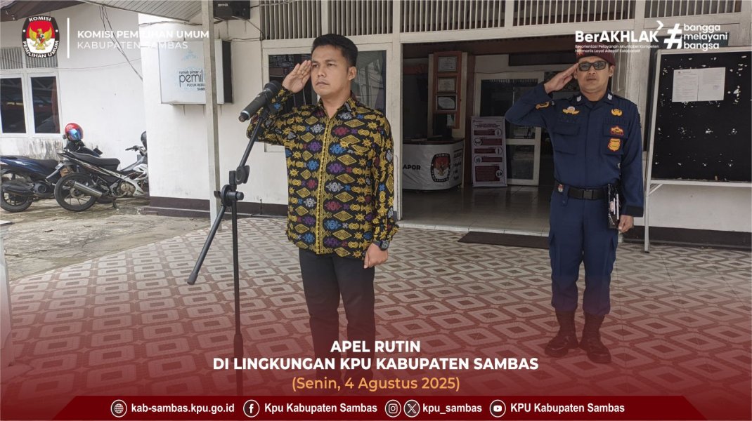 sambas.kpu.go.id-Sambas, KPU Kabupaten Sambas Melaksanakan Apel Rutin Senin. Bertindak Sebagai Pembina Ketua Divisi Perencanaan, Data dan Informasi KPU Kabupaten Sambas, Risno. Diikuti Ketua dan Anggota KPU Kabupaten Sambas, Kasubbag, Pegawai dan Staf Sekretariat KPU Kabupaten Sambas Beserta Anak Magang Mahasiswa Perguruan Tinggi POLTESA dan UNISSAS Dalam Rangka Kerja Praktek di KPU Kabupaten Sambas. Senin (4/8/2025). Bertempat di Halaman Kantor KPU Kabupaten Sambas.