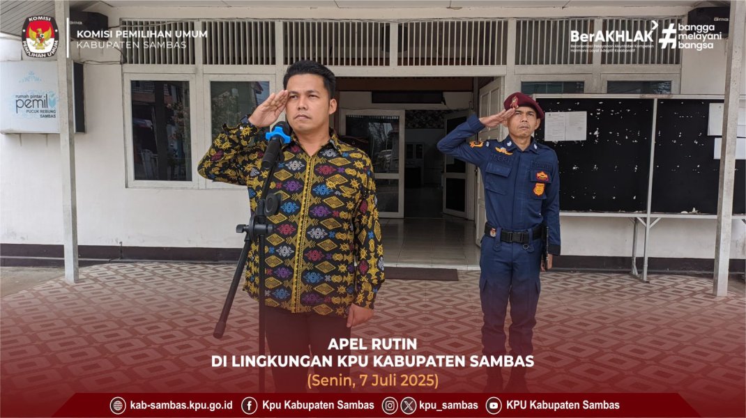 sambas.kpu.go.id-Sambas, KPU Kabupaten Sambas Melaksanakan Apel Rutin Senin. Bertindak Sebagai Pembina Ketua Perencanaan, Data dan Informasi KPU Kabupaten Sambas, Risno. Diikuti Ketua dan Anggota KPU Kabupaten Sambas, Kasubbag, Pegawai dan Staf Jajaran Sekretariat KPU Kabupaten Sambas. Senin (7/7/2025). Bertempat di Halaman Kantor KPU Kabupaten Sambas.