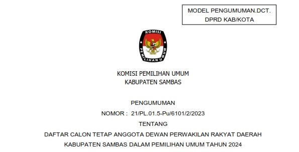 Sambas, kab-sambas.kpu.go.id - Pengumuman Nomor 21/PL.01.5-Pu/6101/2/2023 tentang Daftar Calon Tetap Anggota DPRD Kabupaten Sambas dalam Pemilihan Umum Tahun 2024.