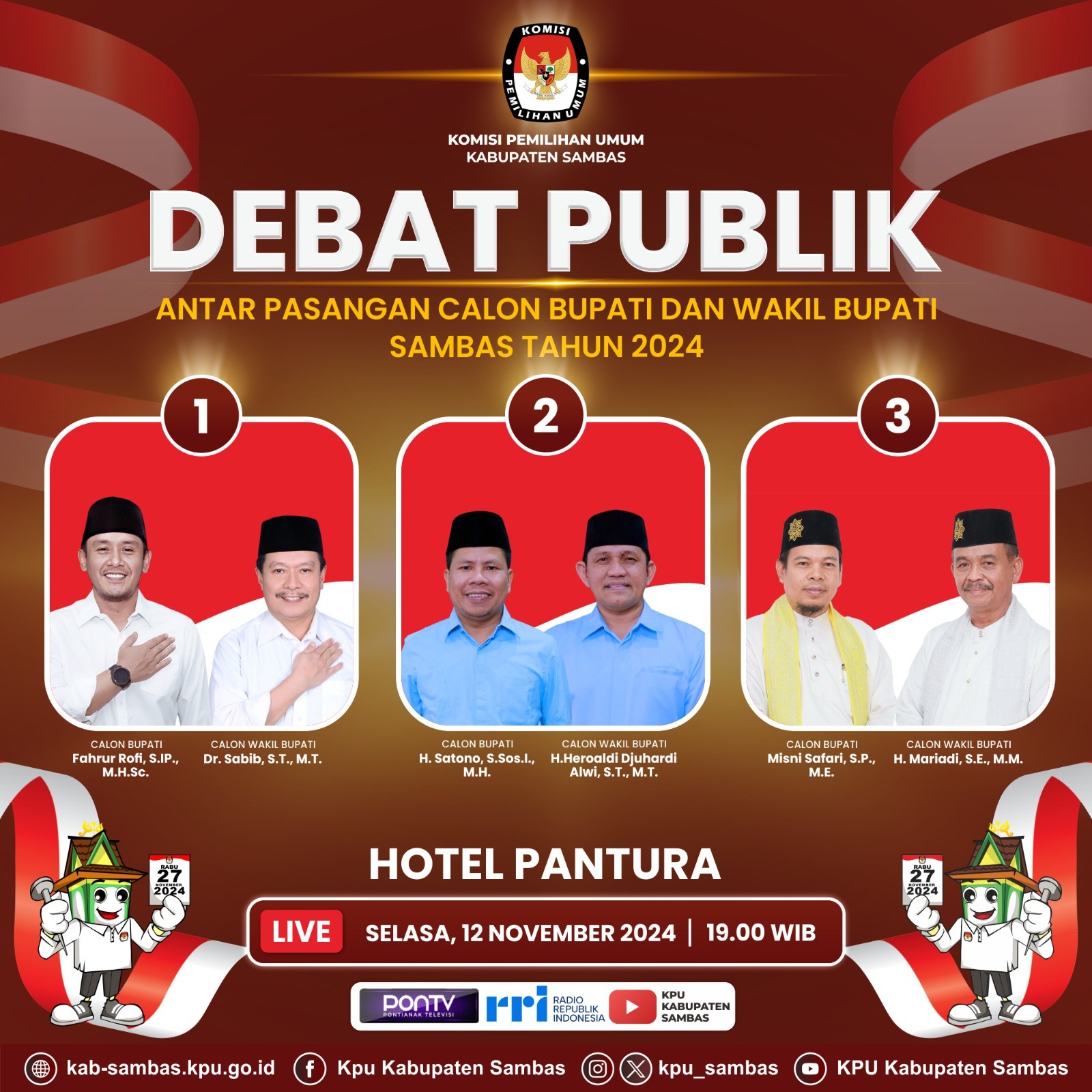 Anggota Komisi Pemilihan Umum Kabupaten Sambas Aan Sumantri mengatakan hari ini, Selasa (12/11) malam, akan digelar debat publik pasangan calon bupati dan wakil bupati. Kegiatan ini dilaksanakan di Ballroom Hotel Pantura Jaya Sambas yang akan diikuti oleh tiga pasangan calon.