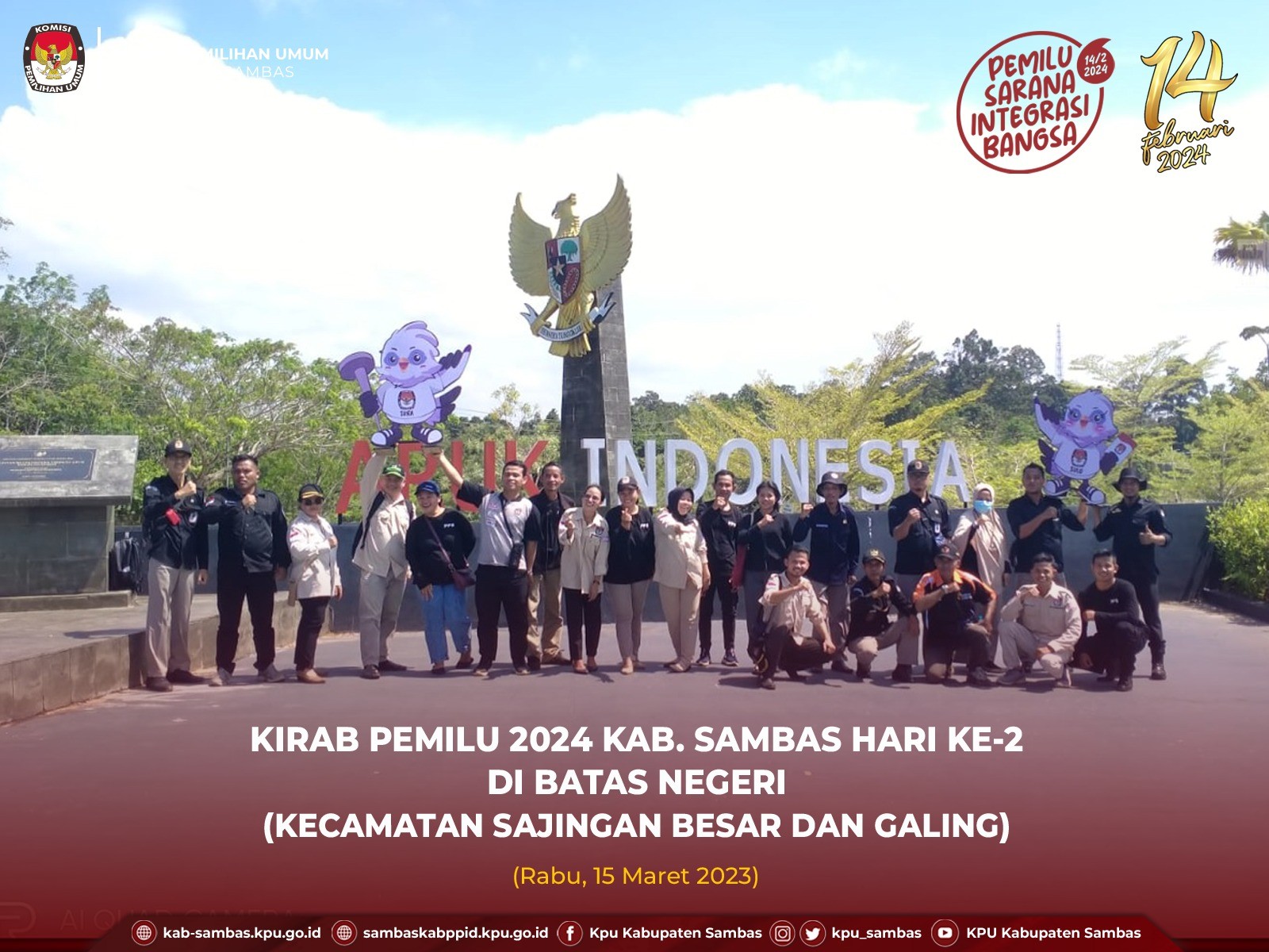 Sambas, kab-sambas.kpu.go.id - KPU Sambas melaksanakan Kirab Pemilu Tahun 2024 Hari ke-2 di Batas Negeri terdiri dari 2 Kecamatan yaitu Kecamatan Sajingan Besar dan Galing, Rabu (15/3/2023). Masyarakat di 2 Kecamatan tersebut menjadi sasaran sosialisasi dan pendidikan pemilih dalam pelaksanaan Kirab ini.