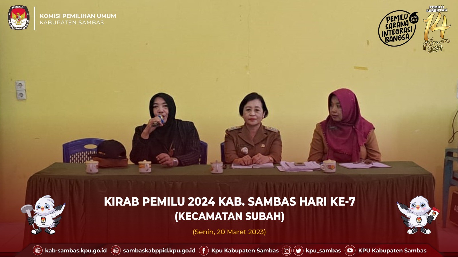 Sambas, kab-sambas.kpu.go.id - KPU Sambas melaksanakan Kirab Pemilu Tahun 2024 Hari ke-7 di Kecamatan Subah, Senin (20/3/2023). Pelaksanaan Kirab di Kecamatan ini difasilitasi oleh Camat Subah beserta jajaran pada pertemuan Perangkat Desa se-Kecamatan Subah. Hadir yaitu tim dari KPU Sambas, Polres Sambas, Dinas Perhubungan Kab. Sambas, Polsek setempat, PPK dan PPS beserta Panwascam Subah.