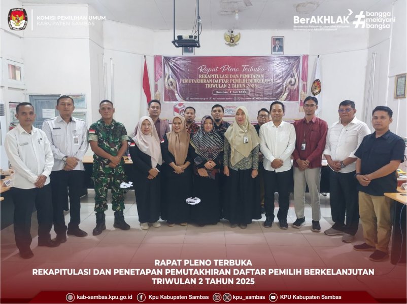 Saat Rekapitulasi Pemutakhiran Data Pemilih Berkelanjutan Triwulan II Tahun 2025 KPU Kabupaten Sambas menetapkan sebanyak 460.105 Pemilih, dengan rincian 234.524 Pemilih Laki-laki dan 225.581 Pemilih Perempuan yang tersebar di 19 kecamatan dan 195 Desa.