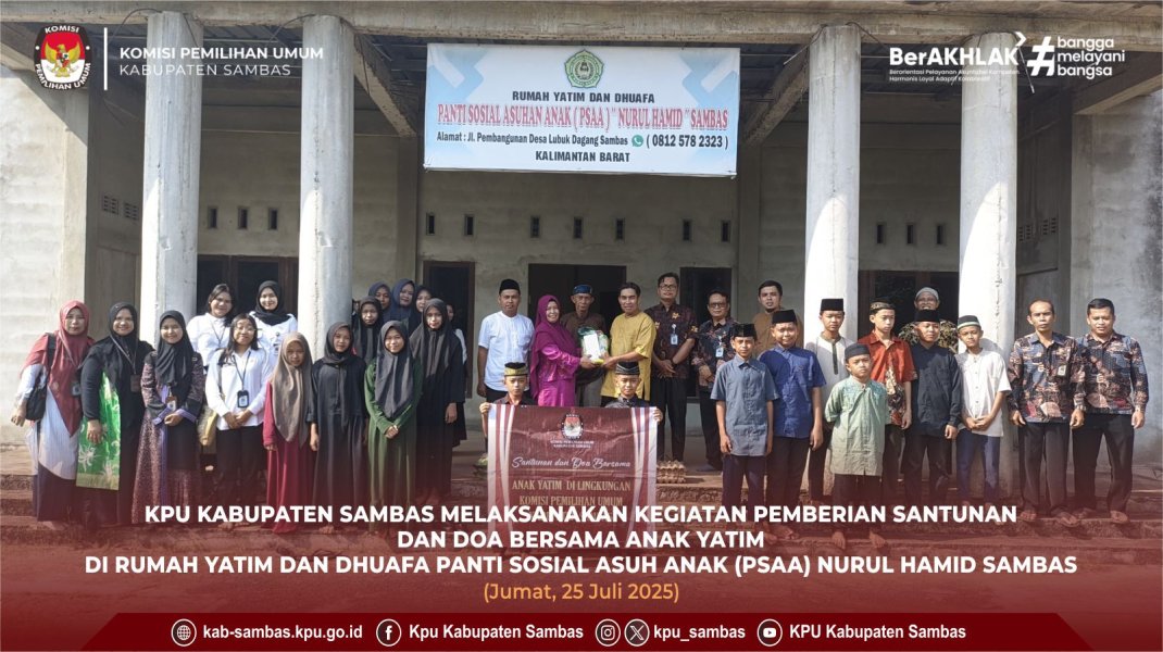sambas.kpu.go.id - KPU Kabupaten Sambas Melaksanakan Kegiatan Pemberian Santunan dan Doa Bersama Anak Yatim. Jumat (25/7/2025). Kegiatan yang Dilaksanakan Secara Serentak Oleh KPU RI, KPU Provinsi, dan KPU Kabupaten/Kota di Seluruh Indonesia ini Dalam Rangka Bentuk Kepedulian KPU Terhadap Generasi Bangsa dan Mempererat Tali Silaturahmi Serta Meningkatkan Solidaritas Antar Sesama. Bertempat di Rumah Yatim dan Dhuafa Panti Sosial Asuhan Anak (PSAA) Nurul Hamid Sambas, Diikuti Oleh Ketua dan Anggota KPU Kabupaten Sambas, Sekretaris, Kasubbag dan Staf Beserta Seluruh Jajaran Sekretariat KPU Kabupaten Sambas.