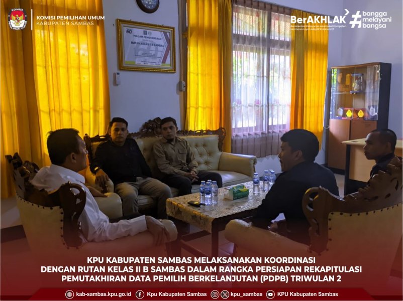 sambas.kpu.go.id - Sambas, KPU Kabupaten Sambas melakukan koordinasi dengan Rutan Kelas IIB Sambas dalam rangka persiapan rekapitulasi Pemutakhiran Data Pemilih Berkelanjutan Triwulan 2. Di Ruang Pertemuan Kantor Rutan Kelas II B Sambas, Selasa (1/7/2025). Koordinasi Diikuti oleh Ketua Divisi Perencanaan, Data dan Informasi KPU Kabupaten Sambas, Ketua Divisi Sosialisasi Pendidikan Pemilih, Partisipasi, Hubungan Masyarakat dan SDM KPU Kabupaten Sambas, Admin/Operator Sidalih KPU serta Staf Sekretariat KPU Kabupaten Sambas.