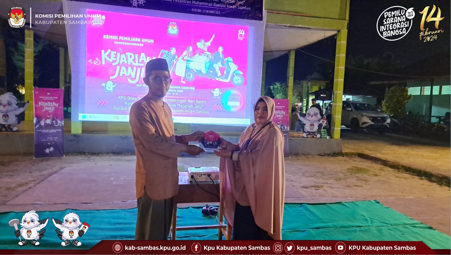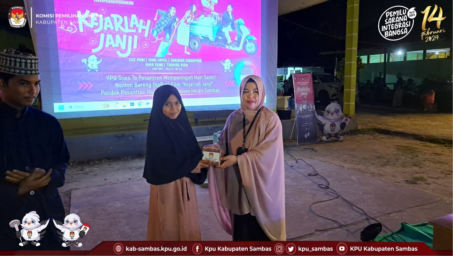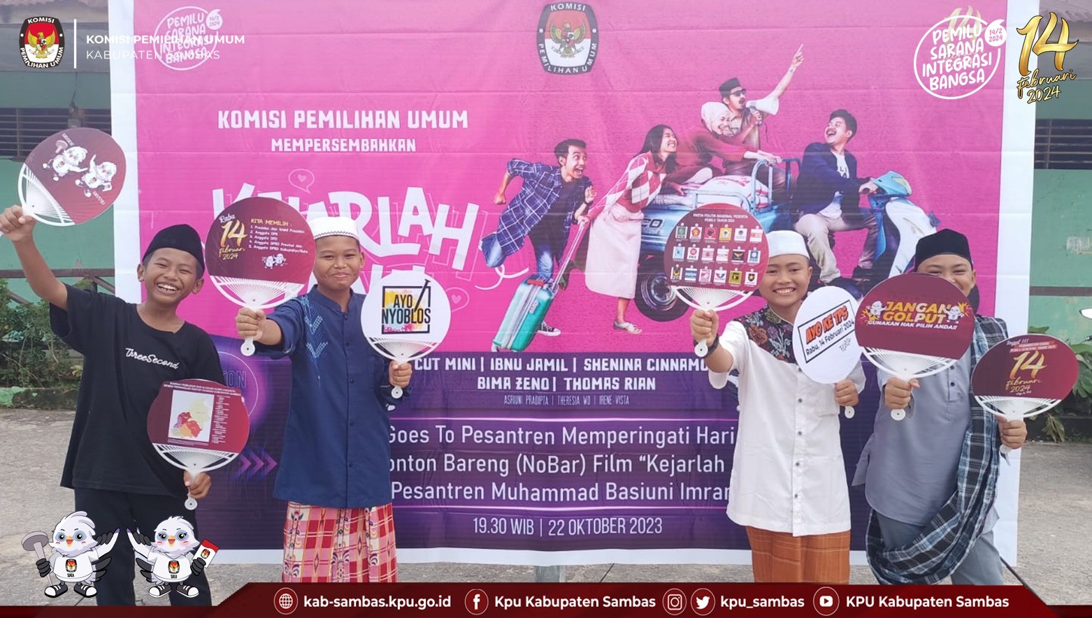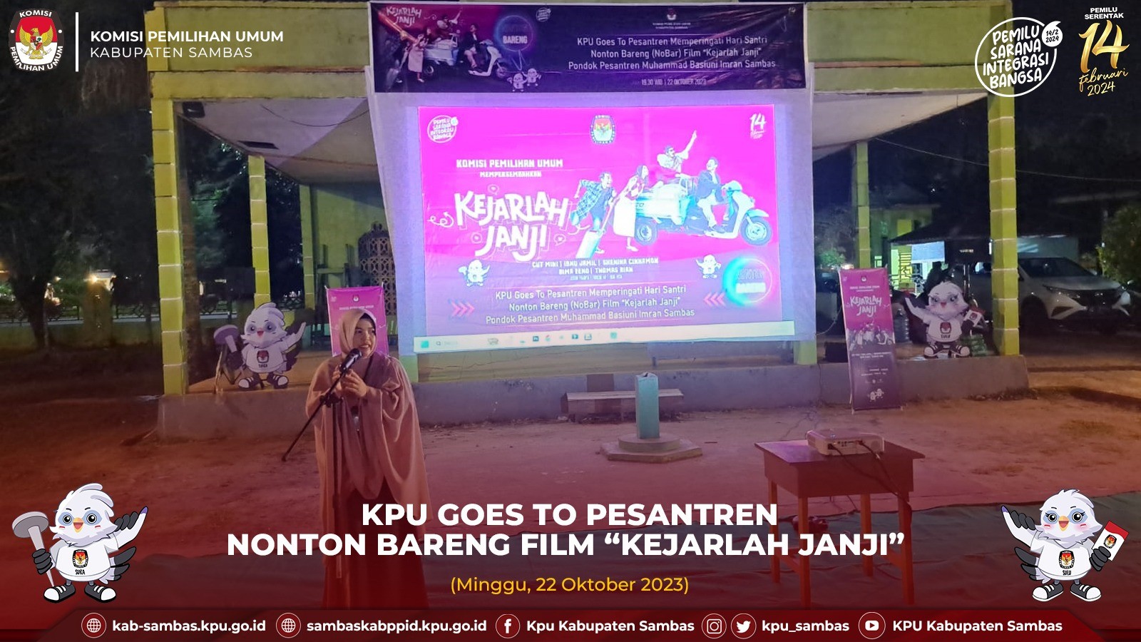 Sambas, kab-sambas.kpu.go.id - KPU Kabupaten Sambas menggelar kegiatan Nonton Bareng Film "Kejarlah Janji" yang dihadiri oleh para Santri bertempat di Pondok Pesantren Muhammad Basiuni Imran Sambas, Minggu (22/10/2023).