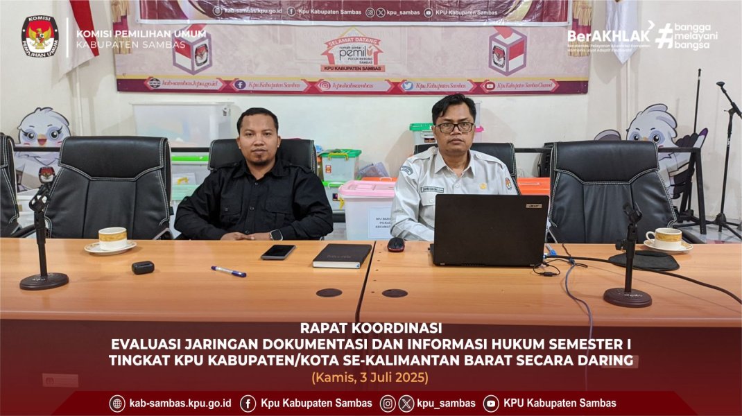 sambas.kpu.go.id - Sambas, KPU Kabupaten Sambas Mengikuti Rapat Koordinasi Evaluasi Jaringan Dokumentasi dan Informasi Hukum Semester I Tingkat KPU Kabupaten/Kota Se-Kalimantan Barat yang Dilaksanakan Oleh KPU Provinsi Kalimantan Barat Secara Daring Rapat Koordinasi Dilaksanakan di Ruang Aula Kantor KPU Kabupaten Sambas, Kamis (3/7/2025). Diikuti Oleh Ketua Divisi Hukum dan Pengawasan KPU Kabupaten Sambas, Kasubbag dan Staf Subbag Teknis Penyelenggaraan dan Hukum Sekretariat KPU Kabupaten Sambas