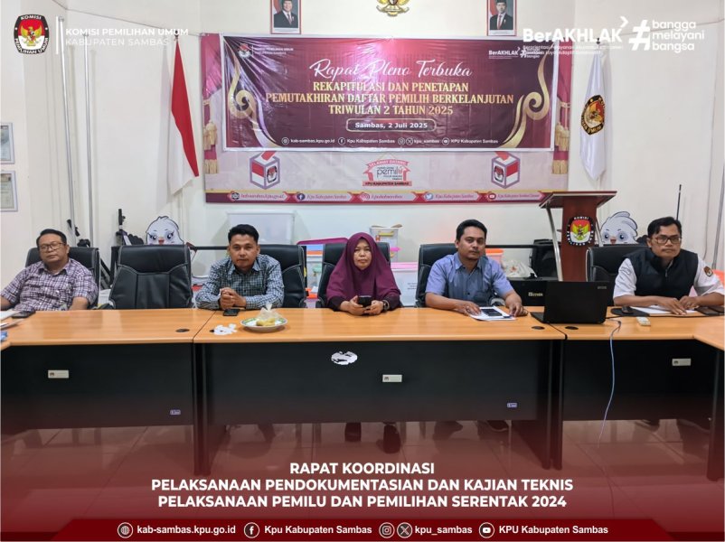 sambas.kpu.go.id - KPU Kabupaten Sambas Mengikuti Rapat Koordinasi Pelaksanaan Pendokumentasian dan Kajian Teknis Pelaksanaan Pemilu dan Pemilihan Serentak Tahun 2024 Bersama KPU Kabupaten/Kota Se-Kalimantan Barat yang Dilaksanakan Oleh KPU Provinsi Kalimantan Barat Secara Daring Rapat Koordinasi Dilaksanakan di Ruang Aula Kantor KPU Kabupaten Sambas, Kamis (24/7/2025). Diikuti Oleh Ketua dan Anggota KPU Kabupaten Sambas, Sekretaris, Kasubbag dan Staf Subbag Teknis Penyelenggaraan dan Hukum Sekretariat KPU Kabupaten Sambas.