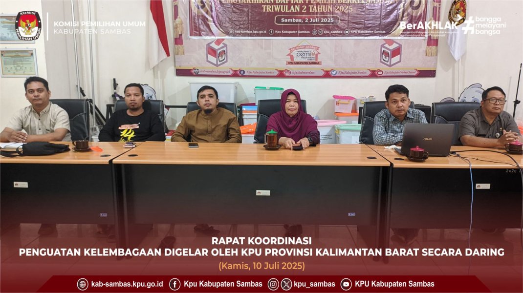 sambas.kpu.go.id - KPU Kabupaten Sambas Mengikuti Rapat Koordinasi Penguatan Kelembagaan yang diselenggarakan oleh KPU Provinsi Kalimantan Barat. Kamis, (10/7/2025) Kegiatan diikuti oleh Ketua dan Anggota KPU Kabupaten Sambas, Sekretaris KPU Kabupaten Sambas, Kasubbag Sekretariat KPU Kabupaten Sambas.