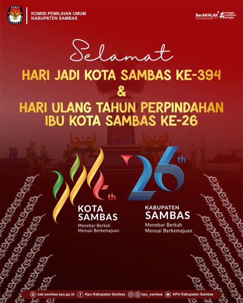 sambas.kpu.go.id - Sambas, KPU Kabupaten Sambas Mengucapkan Selamat Memperingati Hari Jadi Ke-394 Kota Sambas, 9 Juli 2025 dan Hari Ulang Tahun Ke-26 Perpindahan Ibu Kota Kabupaten Sambas, 15 Juli 2025 "Menebar Berkah, Menuai Berkemajuan".