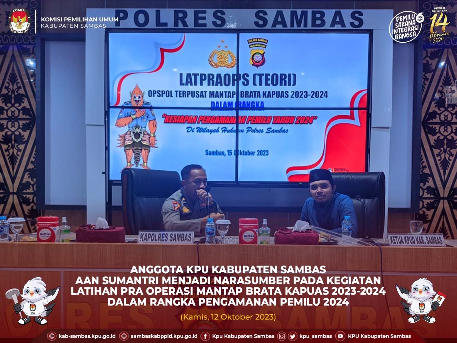 Sambas, kab-sambas.kpu.go.id - Ketua Divisi SOSDIKLIH PARMAS SDM KPU Kab Sambas Aan Sumantri menjadi Narasumber dalam kegiatan Latihan Pra Operasi Mantap Brata Kapuas dalam rangka pengamanan pemilu 2024 di wilayah Hukum polres Sambas, Kamis 12 Oktober 2023
