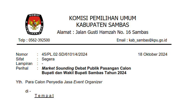 Sehubungan dengan akan diadakannya kegiatan Debat Publik Pasangan Calon Bupati dan Wakil Bupati Sambas Tahun 2024, kami mengundang bapak/ibu/saudara/i untuk menghadiri pertemuan yang akan dilaksanakan pada: