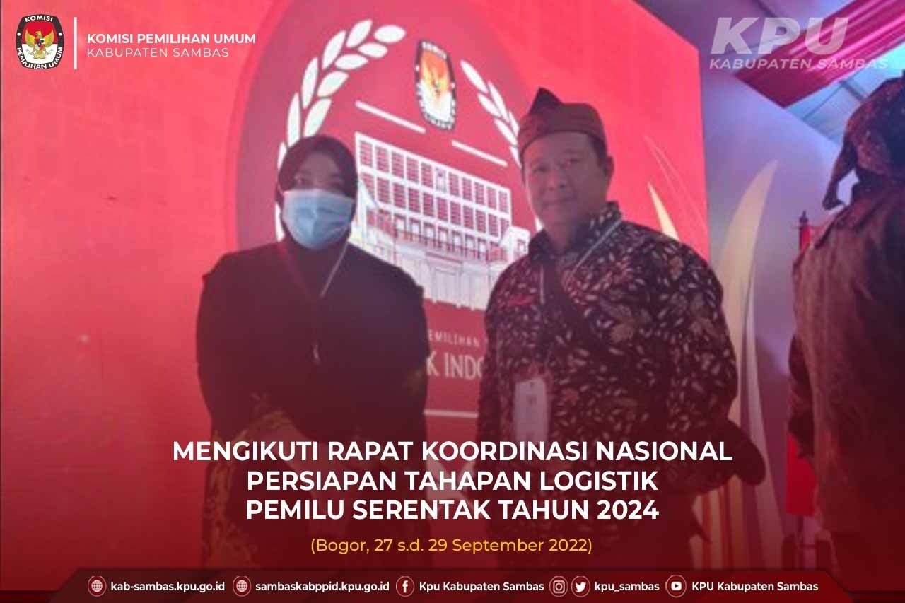 Bogor, kab-sambas.kpu.go.id - Ketua KPU Kabupaten Sambas, Sudarmi dan Sekretaris KPU Kabupaten Sambas, Fathurrahman mengikuti Rapat Koordinasi Nasional Persiapan Tahapan Logistik Pemilu Serentak Tahun 2024 yang diselenggarakan oleh KPU RI pada tanggal 27 s.d. 29 September 2022. Kegiatan yang diikuti lebih kurang 1.200 peserta dari seluruh KPU Provinsi/KIP Aceh dan KPU/KIP Kabupaten/Kota se-Indonesia ini berlangsung di The Highland Park Resort, Bogor, Jawa Barat.