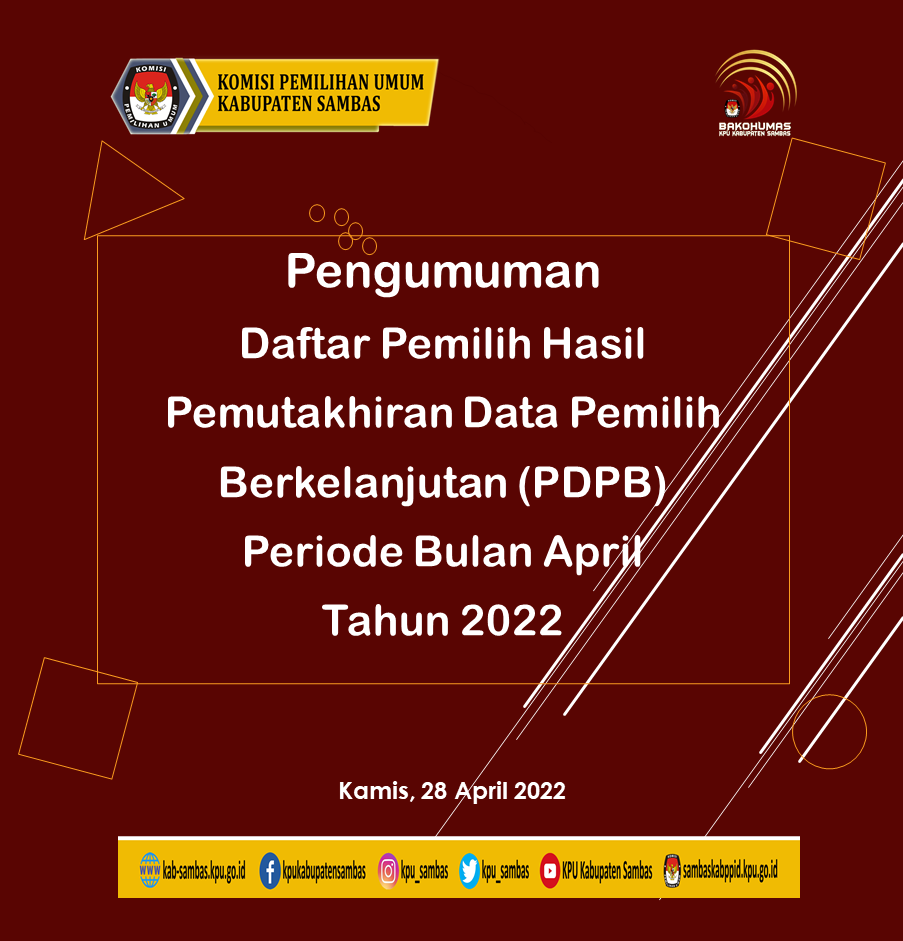 KPU Kabupaten Sambas telah mengeluarkan Pengumuman Daftar Pemilih Hasil Pemutakhiran Daftar Pemilih Berkelanjutan Periode April 2022. Ini sesuai dengan hasil rapat internal yang dihadiri oleh ketua, anggota, sekretaris dan kepala subbagian serta notulen pada Rabu, 27 April 2022.