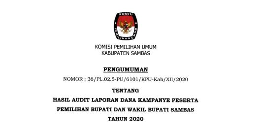 Pengumuman Hasil Audit Dana Kampanye Peserta Pemilihan Bupati dan Wakil Bupati Sambas Tahun 2020 Rabu, 23 Desember 2020 00:00 366 LIHAT PENGUMUMAN Bagikan: Dilihat 366 Kali.