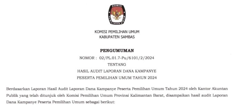 Sambas, kab-sambas.kpu.go.id - Pengumuman Nomor 02/PL.01.7-Pu/6101/2/2024 Tentang Hasil Audit Laporan Dana Kampanye Peserta Pemilihan Umum Tahun 2024.