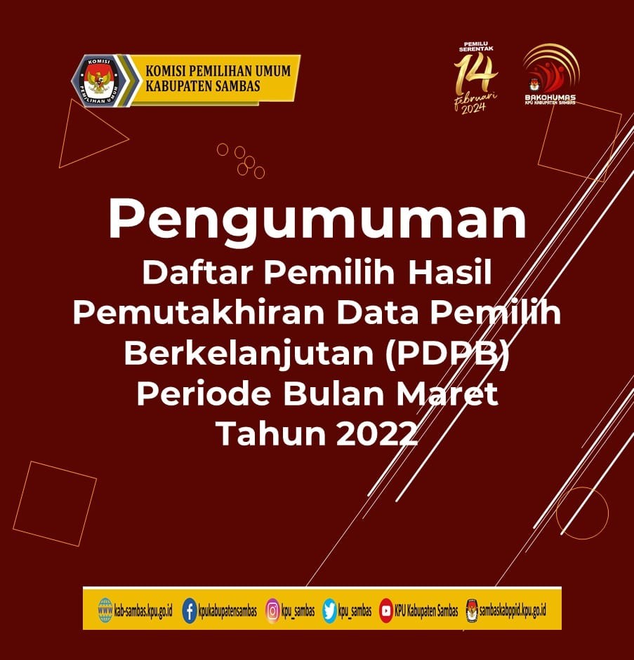 KPU Kabupaten Sambas telah mengeluarkan Pengumuman Daftar Pemilih Hasil Pemutakhiran Daftar Pemilih Berkelanjutan Periode Maret 2022. Ini sesuai dengan hasil rapat koordinasi yang dihadiri oleh KPU Kabupaten Sambas, Ketua Bawaslu Kabupaten Sambas, Partai Politik tingkat Kabupaten Sambas, Dinas Kependudukan dan Pencatatan Sipil, Dinas Sosial, Pemberdayaan Masyarakat dan Desa, Kantor Kesbangpolinmas, POLRES Sambas; KODIM 1208 Sambas; Batalyon Infanteri 645/GTY; DPC APDESI; DPC P-APDESI, DPD ABPEDSI; DPD PPDI; serta dihadiri pula secara daring via zoom meeting Pemerintah Desa yang melaksanakan Pemilihan Kepala Desa Serentak di Kabupaten Sambas Tahun 2022 pada Kamis, 31 Maret 2022.