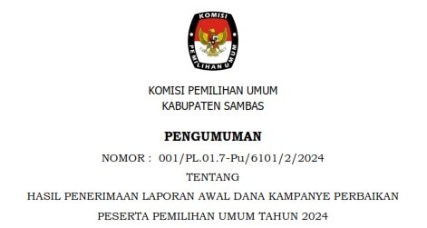 Berdasarkan Tanda Terima dan Berita Acara Penerimaan LADK Perbaikan Tahun 2024 di KPU Kabupaten Sambas, disampaikan hasil penerimaan LADK sebagai berikut (Pengumuman Terlampir)