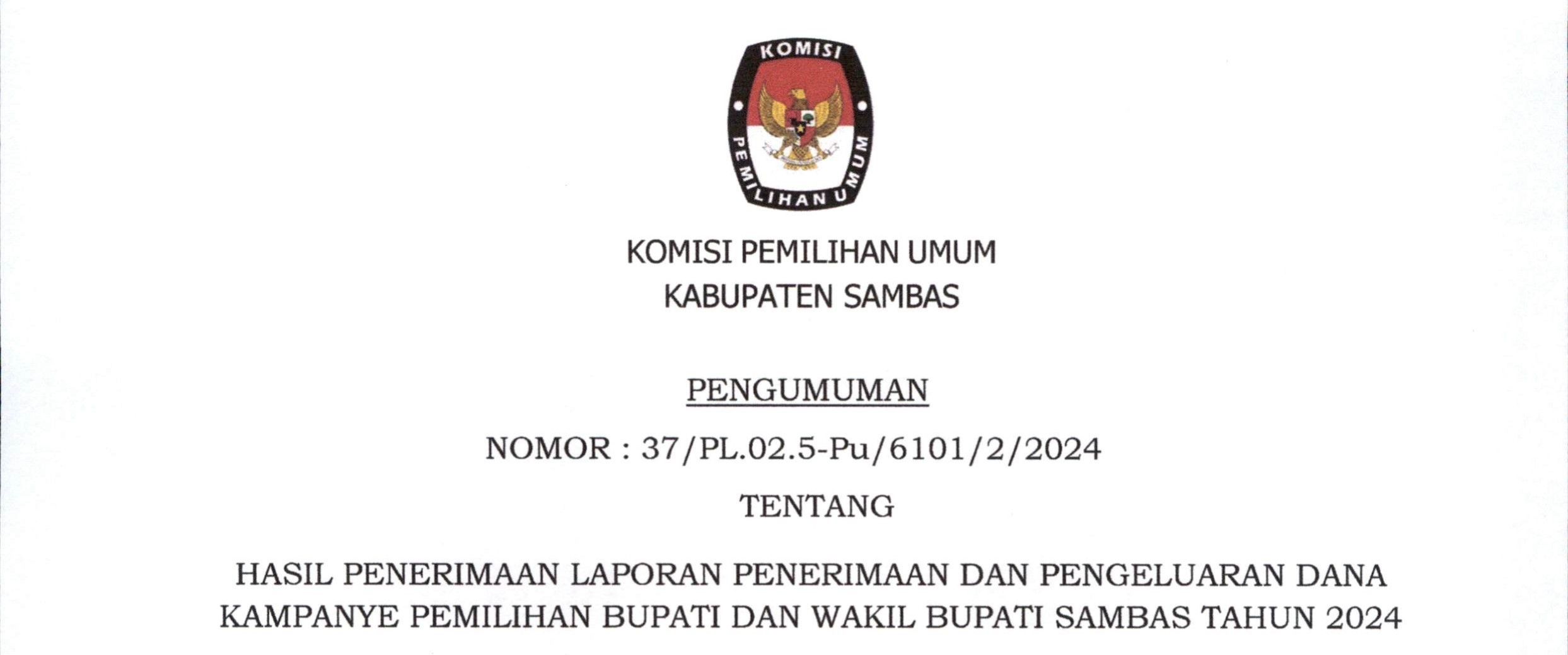 PENGUMUMAN HASIL PENERIMAAN LAPORAN PENERIMAAN SUMBANGAN DANA KAMPANYE PEMILIHAN BUPATI DAN WAKIL BUPATI SAMBAS 2024