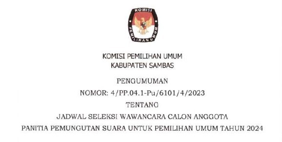 Pengumuman Jadwal Seleksi Wawancara Calon Anggota Panitia Pemungutan Suara (PPS) Pada Pemilihan Umum Tahun 2024 Senin, 16 Januari 2023 17:00 934 DOWNLOAD PENGUMUMAN Bagikan: Dilihat 934 Kali.