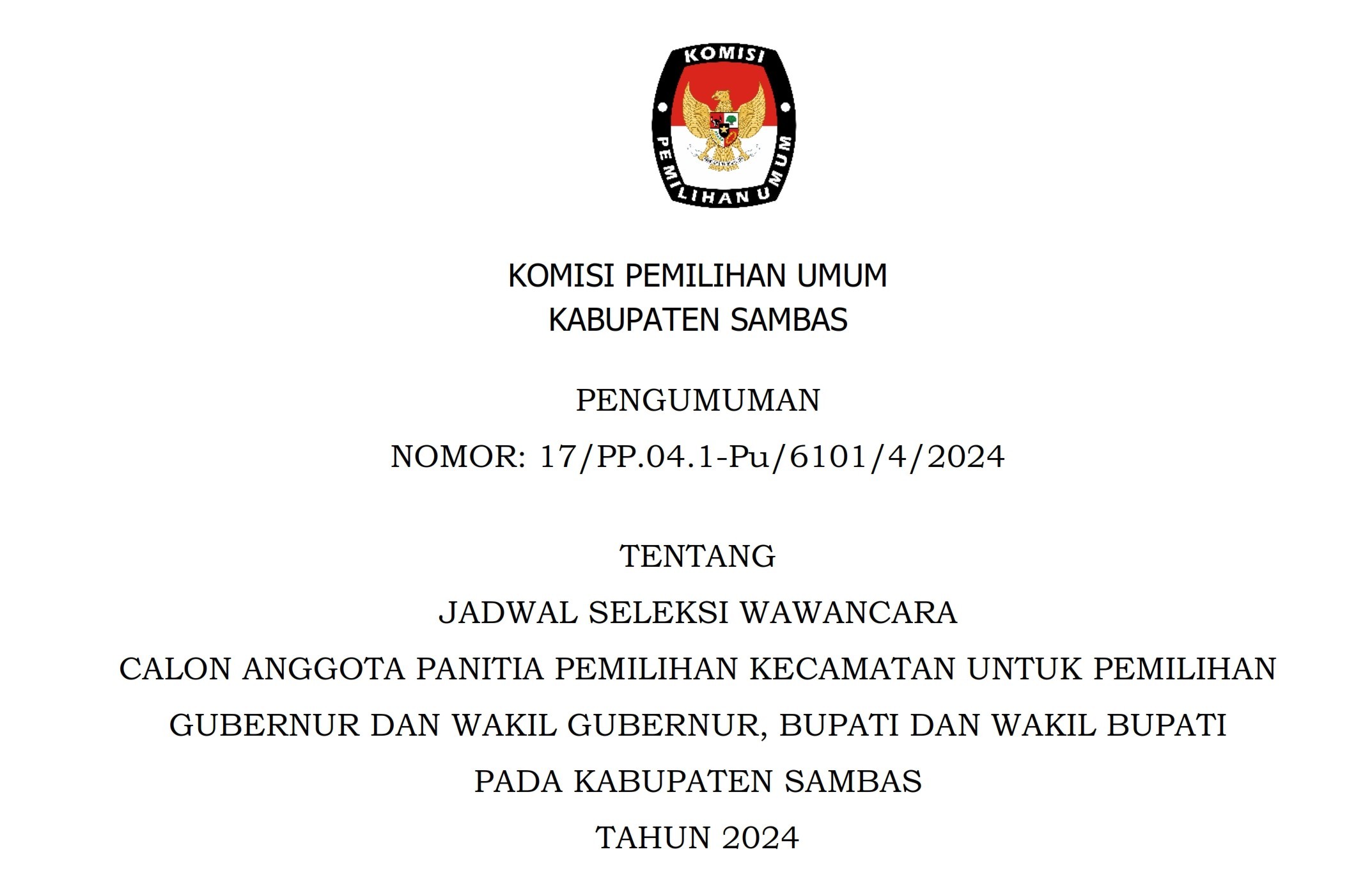 PENGUMUMAN JADWAL SELEKSI WAWANCARA CALON ANGGOTA PPK UNTUK PEMILIHAN GUBERNUR DAN WAKIL GUBERNUR, BUPATI DAN WAKIL BUPATI PADA KABUPATEN SAMBAS TAHUN 2024