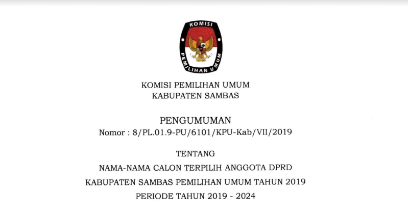 Pengumuman Nama-Nama Calon Terpilih Anggota DPRD Kabupaten Sambas Pemilu 2019 Selasa, 30 Juli 2019 00:00 369 LIHAT PENGUMUMAN Bagikan: Dilihat 369 Kali.
