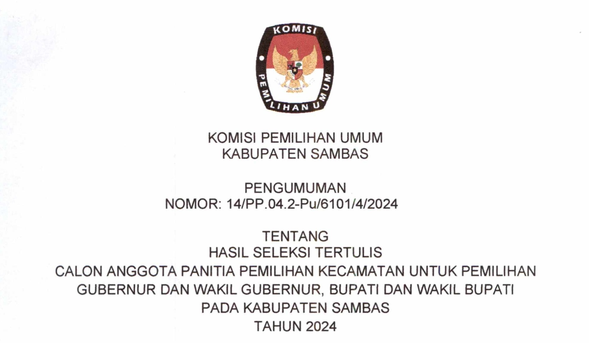PENGUMUMAN PEMBAGIAN SESI UJIAN SELEKSI CALON ANGGOTA PPK UNTUK PEMILIHAN GUBERNUR DAN WAKIL GUBERNUR, BUPATI DAN WAKIL BUPATI PADA KABUPATEN SAMBAS TAHUN 2024