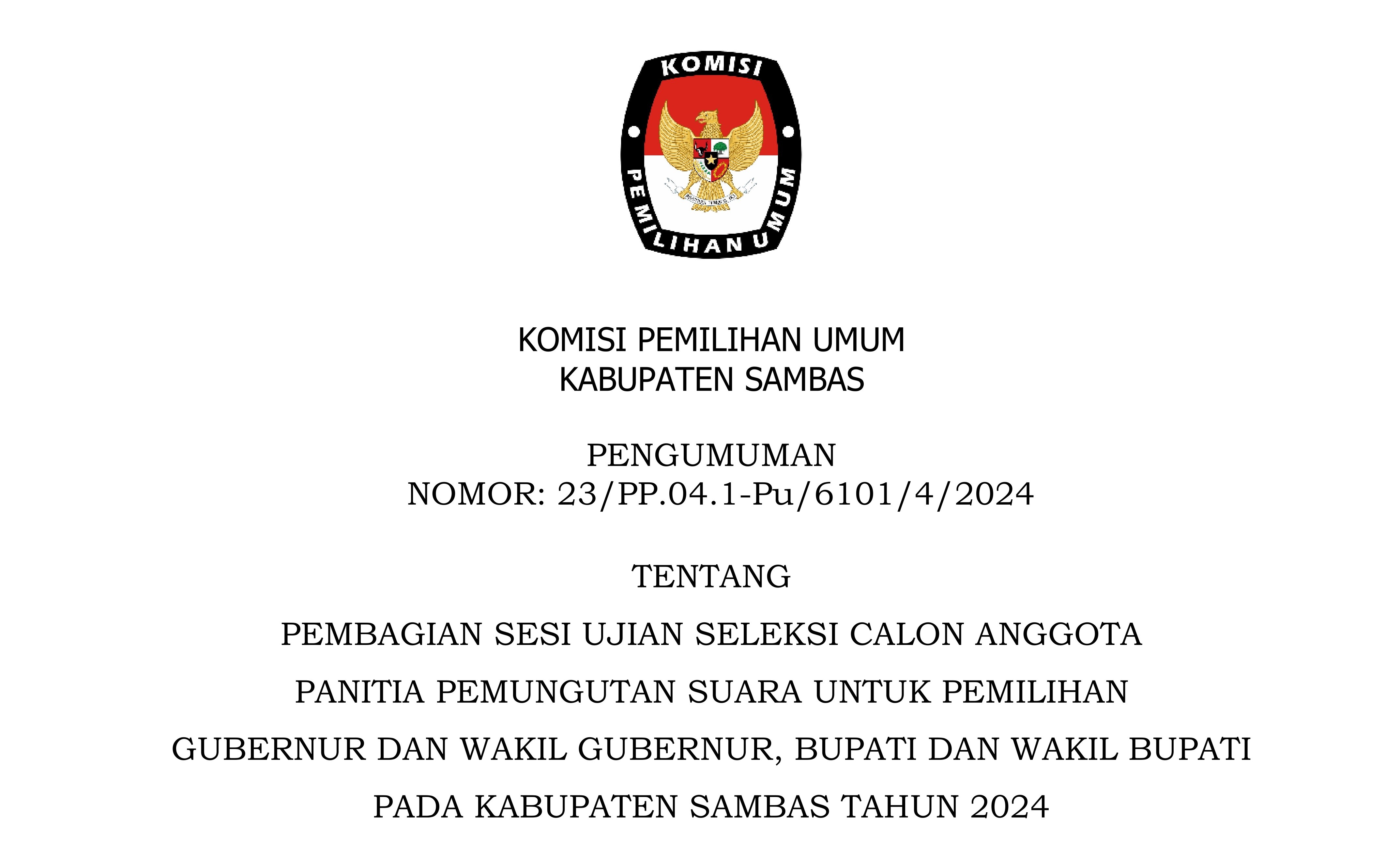 PENGUMUMAN PEMBAGIAN SESI UJIAN SELEKSI CALON ANGGOTA PPS UNTUK PEMILIHAN GUBERNUR DAN WAKIL GUBERNUR, BUPATI DAN WAKIL BUPATI PADA KABUPATEN SAMBAS TAHUN 2024